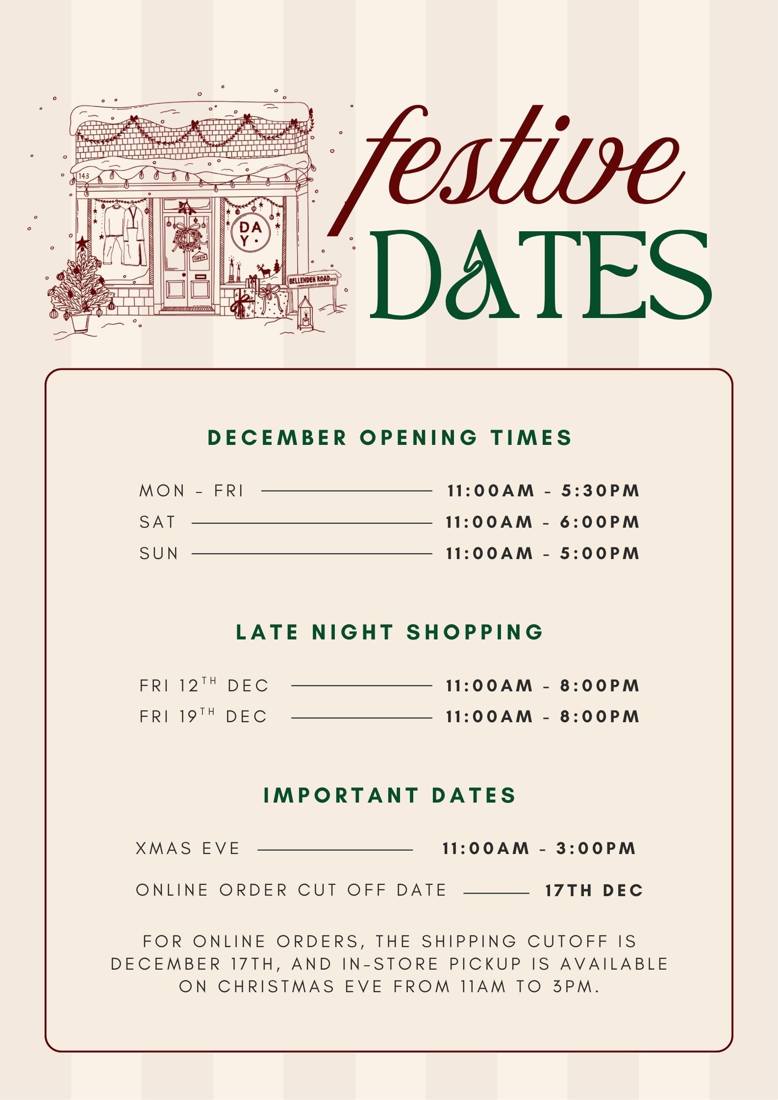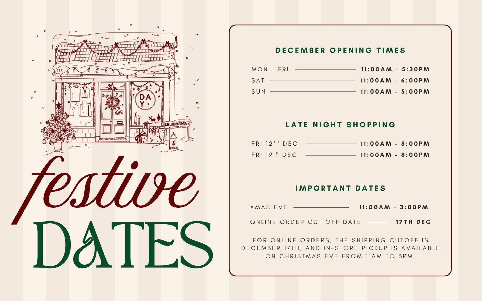 FOR ONLINE ORDERS, THE SHIPPING CUTOFF IS DECEMBER 17TH, AND IN-STORE PICKUP IS AVAILABLE ON CHRISTMAS EVE FROM 11AM TO 3PM.